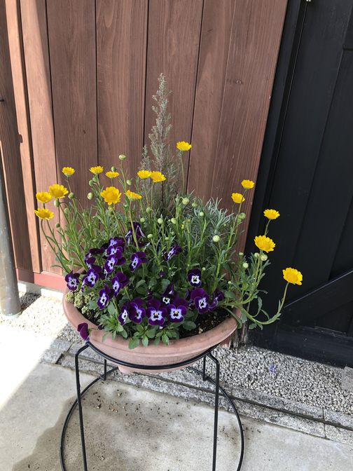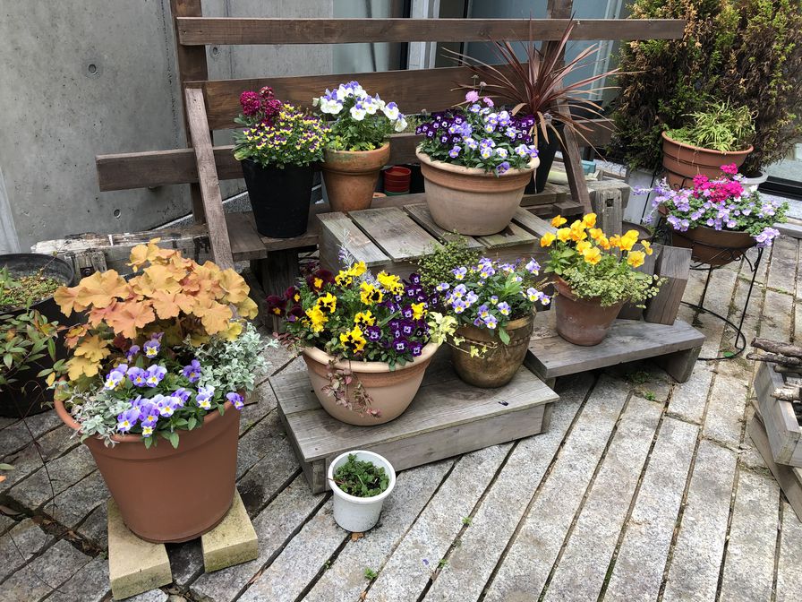 中庭ではパンジーやビオラなどの春の花が見頃を迎えています。