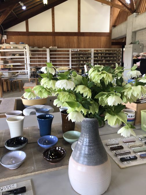 ロクロ体験のスペースには、クリスマスローズが飾られています。