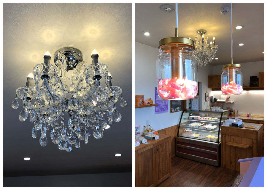 ジャム瓶をリメイクしたようなペンダントライトの中には、キャンディーパーツが入っています!