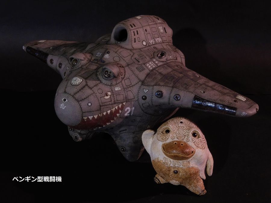 クリっとした目に丸みのあるフォルム、とぼけた表情が愛らしくも、描かれた文様や細部をまじまじと眺めていると、なんだか畏敬の念も感じるような…唯一無二の世界観を持つ田崎さんの作品は、2012年の「大地の芸術祭 越後妻有アートトリエンナーレ」や日本最大のアートの見本市「アートフェア東京」、銀座三越などに出展され、現代アートとしての評価も高く、展示会をすれば完売する人気ぶりだ。展示会で出品する作品は全て手びねりで一品もの。人間の文明を寓意的に表現した『ペンギン種族』、狛犬からヒントを得たオリジナル作品の『仔猫神』や『龍神』など、自身は「工房火の玉発動機」の工房長として、そんな不思議な“いきもの”たちに日々命を吹き込んでいる。