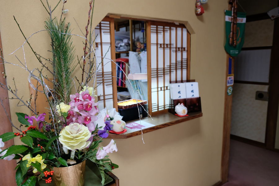 昔ながらの旅館といった風情溢れる佇まい。笠間の旅館らしく客室や宴会場の部屋札は笠間焼で作られ、各部屋や廊下など随所に活けられた生花がぱっと場を明るく華やかにする。