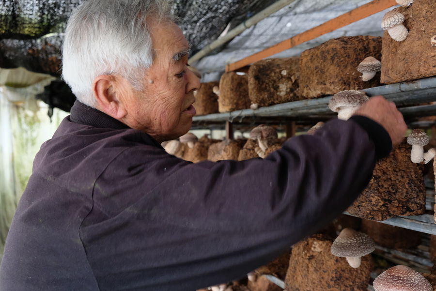 原木で始めたシイタケ作りだが、重い原木を運ぶよりも自身の身体のことを考え、60代後半からは菌床での栽培を始めた。変わらず大きくて美味しいシイタケを作り続けるため、日々研究の毎日だ。地下からの湿度が肝心だというシイタケ栽培。一つ一つ人の手をかけ、今でも大きいシイタケができるのが楽しいし、どんどんできるシイタケが可愛いと言う。
